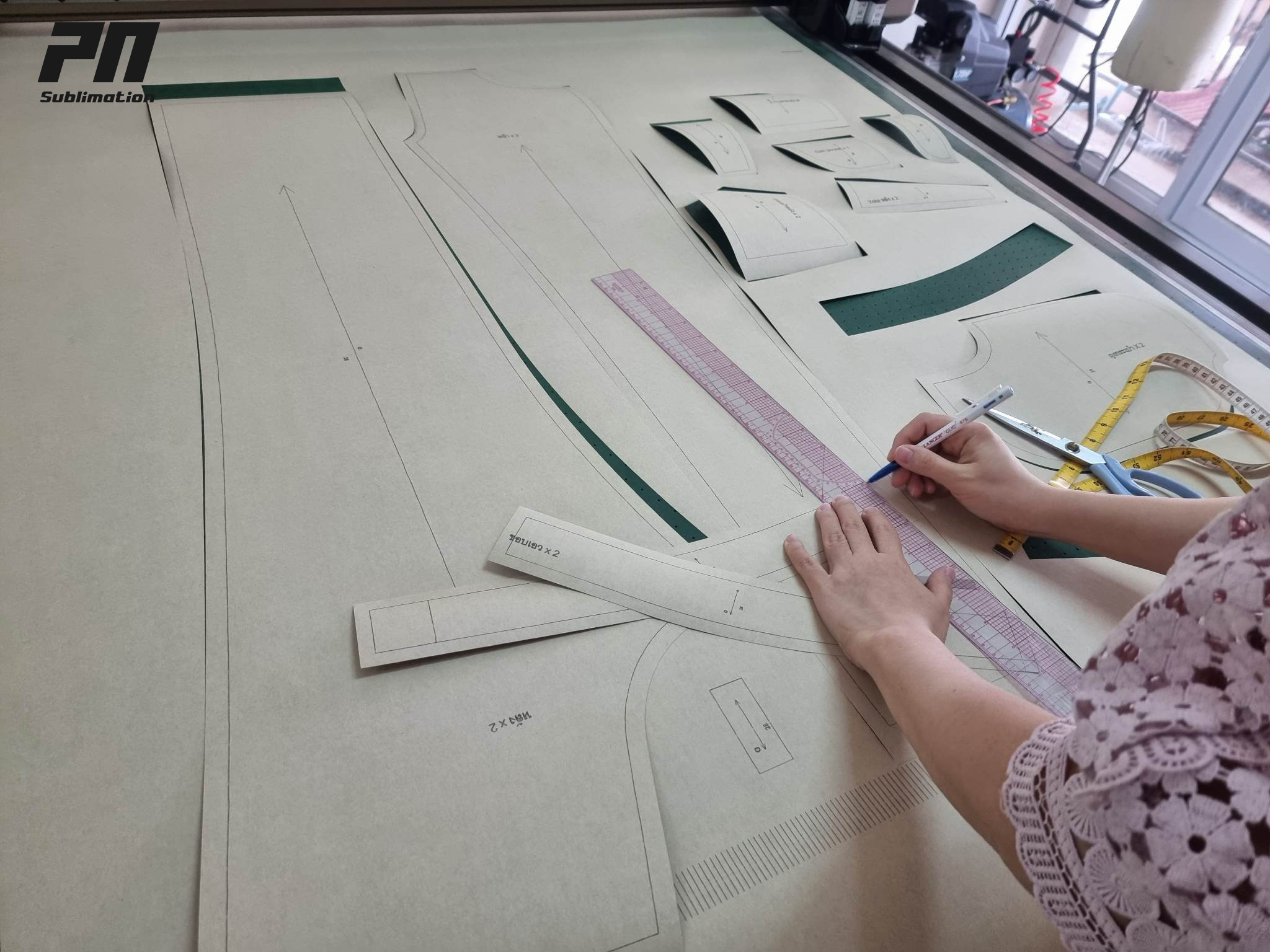 แพทเทิร์นของทางร้านใช้เครื่องวาดและตัดแพทเทิร์นแบบอัตโนมัติ(Winda Flat-bed inkjet cutter ) ซึ่งเครื่องตัดสามารถตัดชิ้นงานแพทเทิร์นได้อย่างแม่นยำ ตรงตามแพทเทิร์นที่โปรแกรมสร้างใว้ครับ